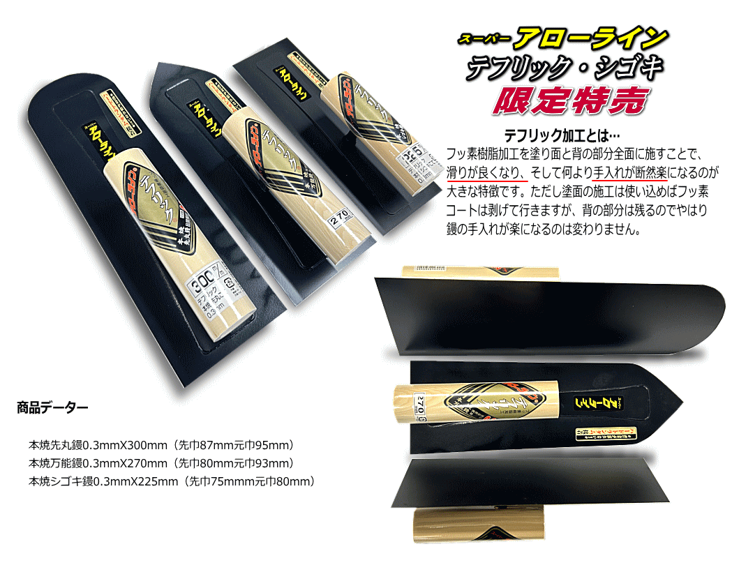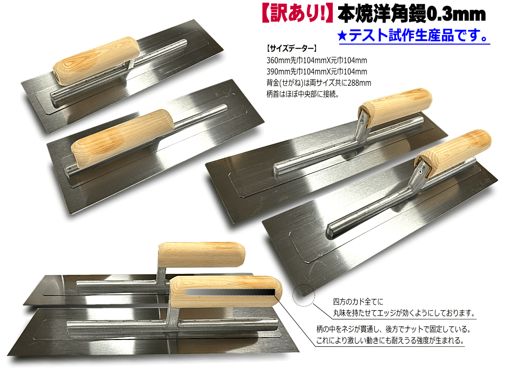 土間屋さんご用達のあの本焼2段張り洋角鏝0.3mmの試作生産品となります。