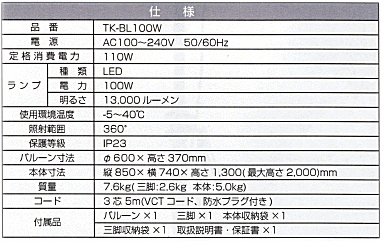 - [商品名] バルーン式投光器 TK-Bl 100W 87211